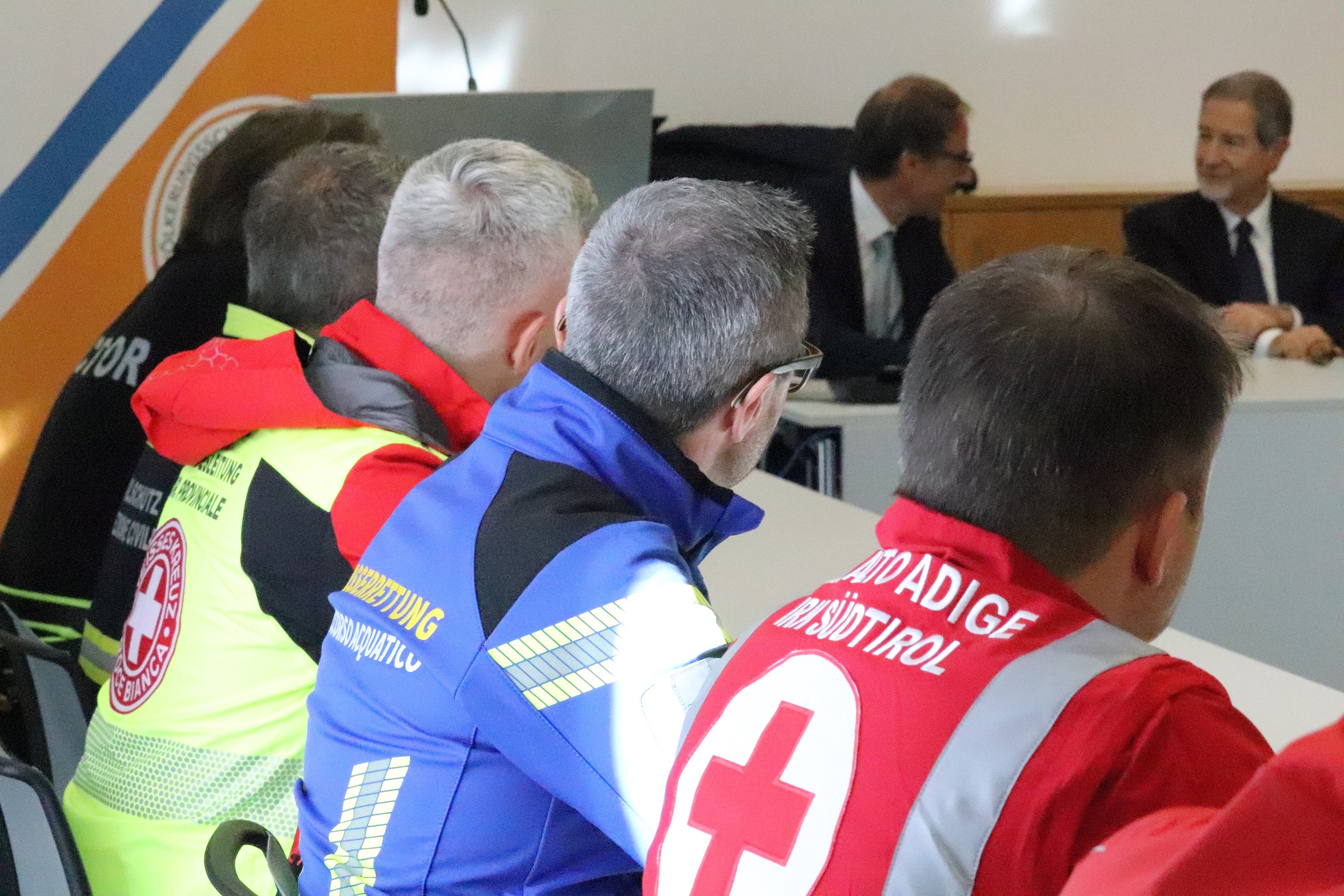 - Weißes Kreuz, Wasserrettung, Rotes Kreuz: Präsidenten von Freiwilligenorganisationen beim Treffen mit Zivilschutzminister Nello Musumeci, im Hintergrund rechts neben dem Direktor der Agentur für Bevölkerungsschutz Klaus Unterweger (Foto: LPA/Maja Clara) » [IMG 2 MB]