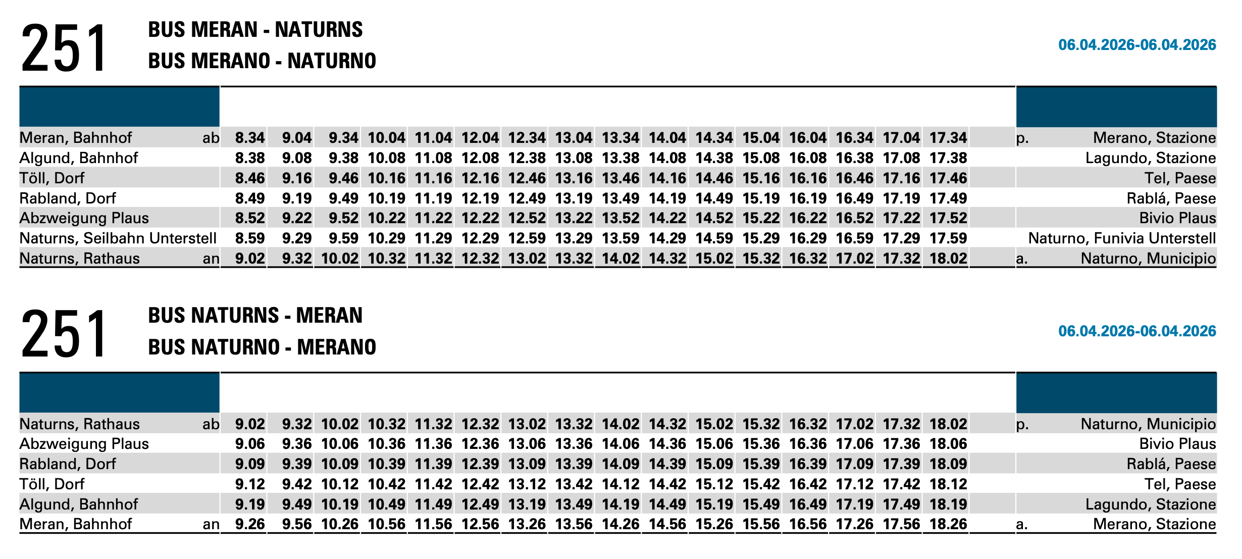 I bus della linea 251 partiranno dalla fermata degli autobus, banchina B, presso il sottopasso della stazione di Merano, con orari leggermente sfalsati rispetto a quelli del servizio sostitutivo. Lungo il percorso fino a Naturno saranno servite le stesse fermate previste per la linea B250.