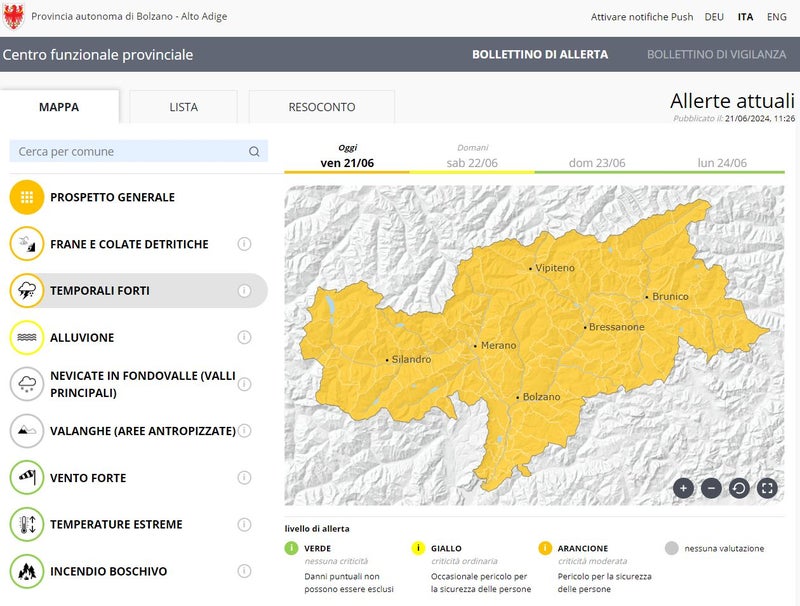 "In previsione di rovesci temporaleschi, oggi a mezzogiorno, durante la Conferenza di valutazione al Centro Funzionale Provinciale è stato deciso di elevare lo stato di Protezione civile al livello di attenzione (Alfa)", riferisce Klaus Unterweger, direttore dell'Agenzia di Protezione Civile. Esso si applica a causa degli imminenti eventi meteorologici in combinazione con il terreno già saturo. Anche l'elevato volume di traffico e alcuni eventi pubblici all'aperto previsti per questo fine settimana in Alto Adige richiedono una maggiore attenzione e monitoraggio.