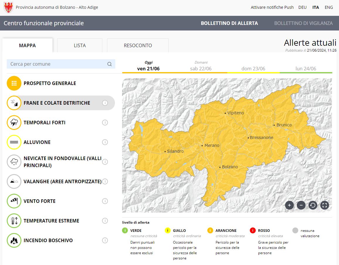 Il rapporto sulla situazione di allerta mostra il secondo livello di allerta più alto, arancione, per oggi e domani, per quanto riguarda i movimenti di massa, le colate detritiche e i forti temporali. "Questo indica eventi diffusi che possono verificarsi in modo violento e improvviso e durare più a lungo", riassume Willigis Gallmetzer, direttore del Centro di allerta provinciale. Possono verificarsi anche cadute di massi, alberi e inondazioni di piccola entità. È particolarmente importante proteggersi dalla rottura e dalla caduta di rami nelle zone abitate. Si prevede un ulteriore innalzamento dei livelli dei fiumi principali e affluenti. I dipendenti di tutti gli uffici statali competenti sono pronti a intervenire.