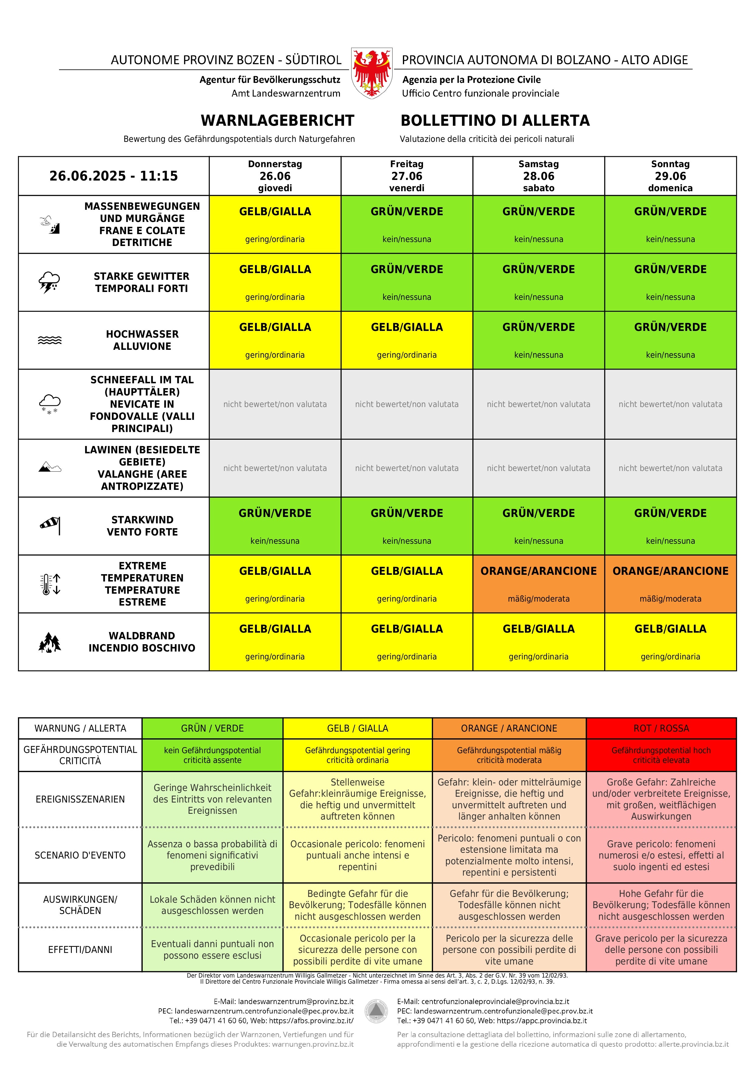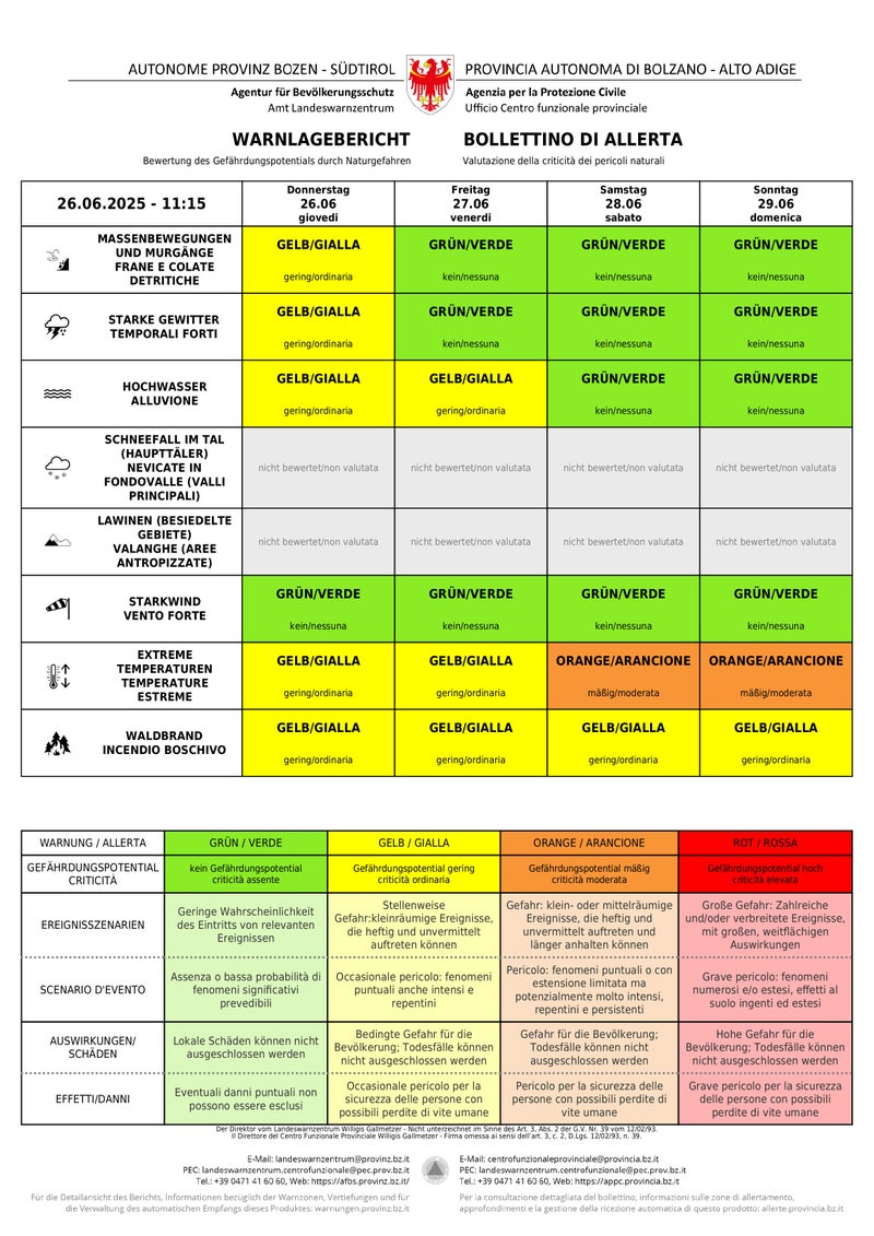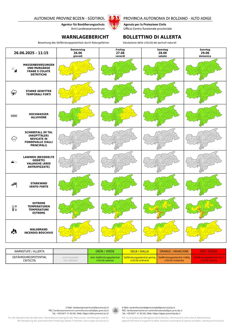 - Livello di allerta giallo per il rischio di forti temporali e smottamenti in tutta la provincia e di inondazioni nella parte orientale dell'Alto Adige; il pericolo di incendi boschivi rimane elevato e le temperature estreme continuano a persistere. (Fonte: Bollettino di allerta del Centro funzionale provinciale dell'Agenzia per la Protezione civile) » [IMG 3 MB]