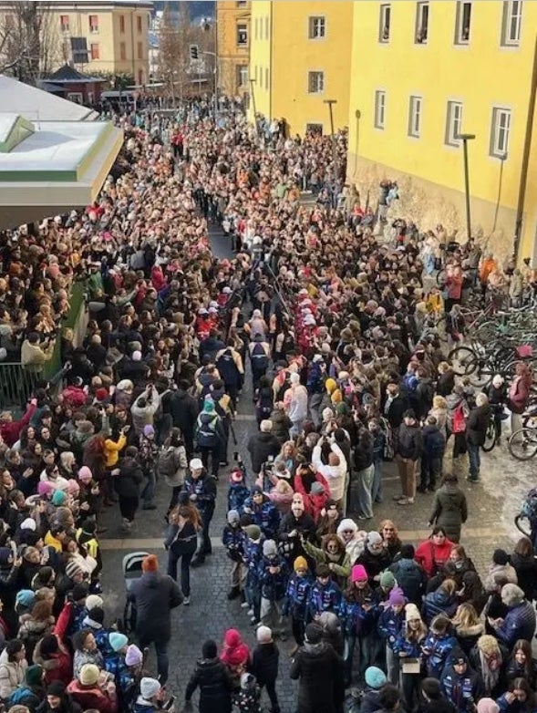 - Un'immagine dall'alto di piazza Paul Tschurtschenthaler a Brunico durante l'arrivo della fiaccola olimpica. La festa nella centralissima piazza proseguirà anche durante i Giochi Olimpici Invernali di Milano Cortina. (Foto: Comune di Brunico/La foto può essere utilizzata solo nel contesto di questo comunicato) » [IMG 408 kB]