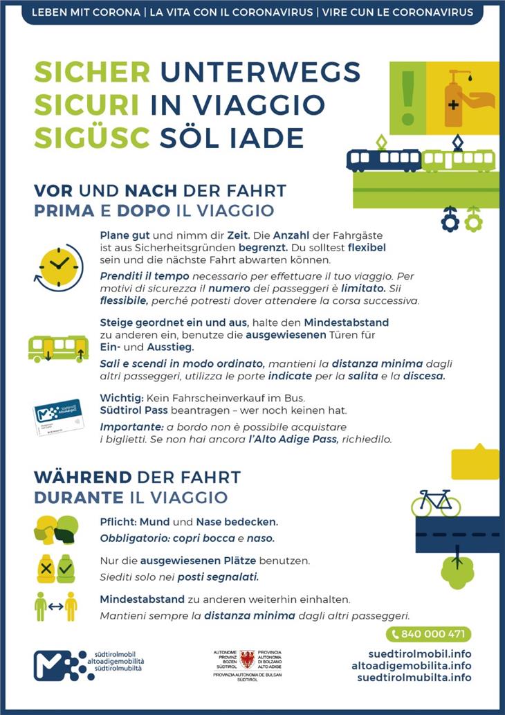 Aladô dles diretives sön la segurëza dl Ministere di trasporc, mëss dötes les porsones che tol i mesi publics mëte averda a n valgönes cosses: vigni passajier/passajiera mëss se curí la bocia y le nes cun n injin individual adegué. Ti veicui pón ma da s'anuzé di posć lëdi cuntrassegná aposta a na moda da mantigní la destanza por se stravardé dal'infenziun. Tl momënt n'él nia a desposiziun posć da sté impé. Ti mesi de trasport mësson sté dainciará almanco un n meter un dal ater y ince intratan che an aspeta él da respeté chësta destanza. An ne pó nia cumpré les chertes sön i veicui, mo ares mëss bele gní cumprades danfora. "A che che n'á nia ciamó le Südtirol Pass ti aconsiunse da damané do, deache chësta cherta garantësc flessibilité y segurëza" dij Alfreider.