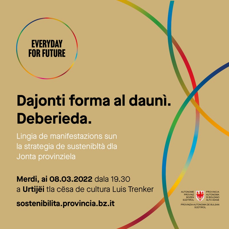 N ucajion dla lingia de manifestazions sun la strategia de sustenibltà dla Jonta provinziela vëniel a se l dé de ndut ot sëires de nfurmazion y ot workshop te dut l Südtirol nchin ai 7 de auril.