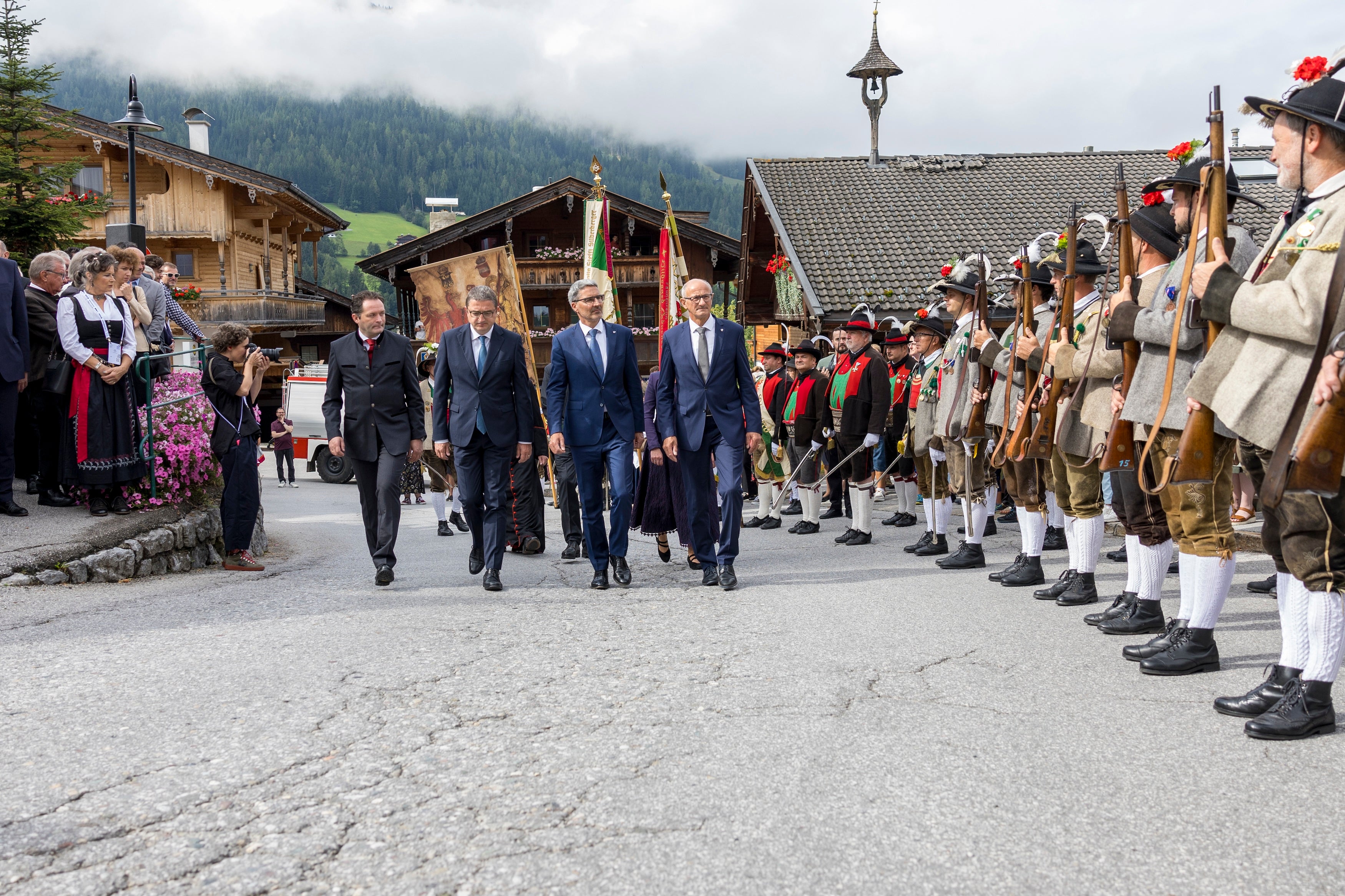 - L bënunì tradiziunel: l minister austriach Norbert Totschnig, l presidënt dla Provinzia de Trënt Maurizio Fugatti, l presidënt dla Euregio y presidënt dla Provinzia de Bulsan Arno Kompatscher y l capitan dl Tirol Anton Mattle ntan che i passa via de furmazion. (Foto: Land Tirol/Sedlak) » [IMG 2 MB]